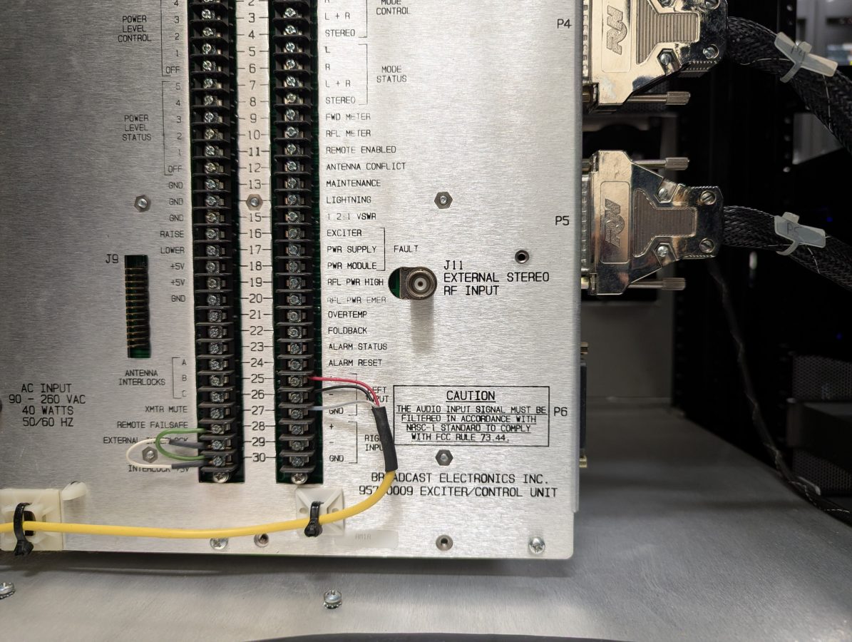 The transmitter has an external RF input on the ECU rear-panel (EXTERNAL STEREO RF INPUT (J1). The input is designed for an external stereo generator or reference oscillator with a signal level from 5 to 15 volts peak-to-peak. To use this input, program jumper P7 on the exciter circuit board in position 1-2. Consult the manual page 2-20.